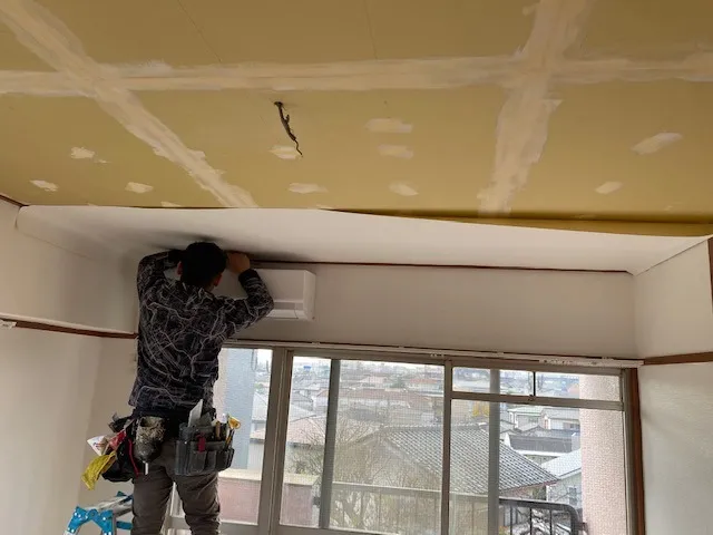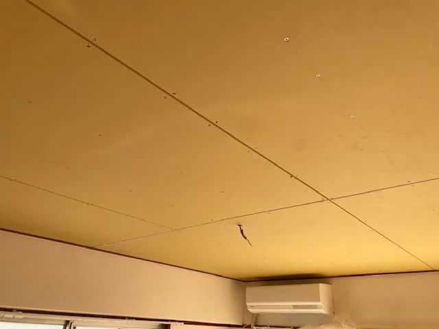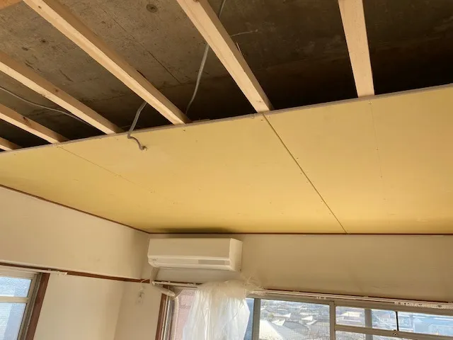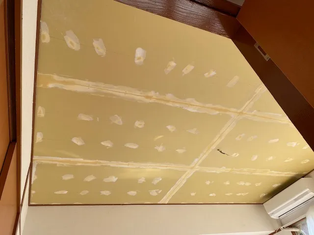 ベランダ、サッシ部からの雨漏り修理と防水工事が終了したため、解体した天井の修繕工事にとりかかります。