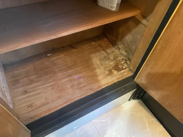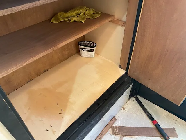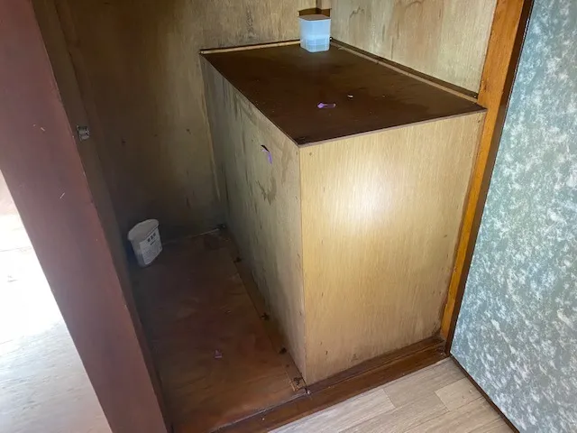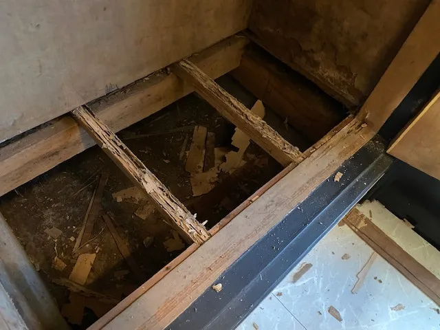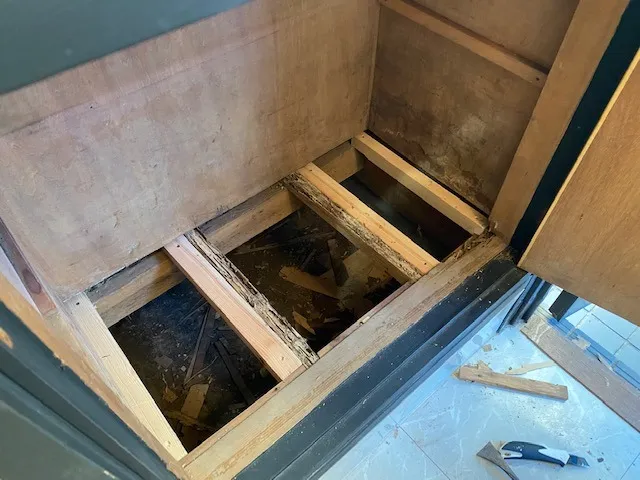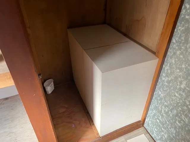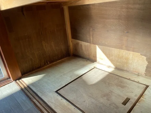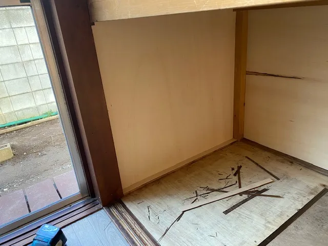 当初ベニヤの重ね張り予定でしたが、劣化がひどいため下地を確認してみることに・・剥がしてみてびっくり!予想以上に下地が傷んでいました。。すぐにオーナーさまに連絡しないと(;゚Д゚)